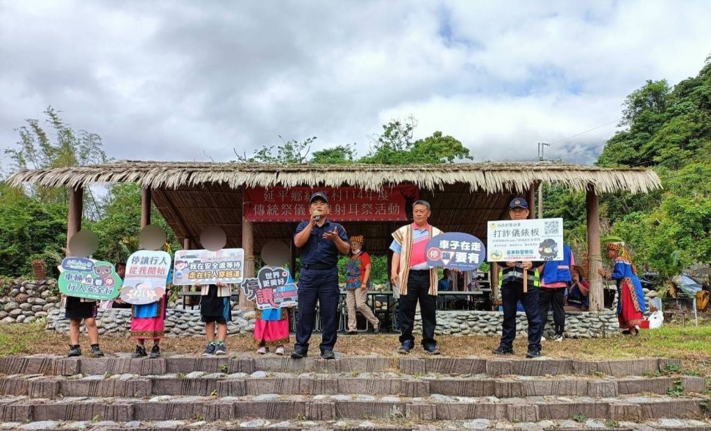 臺東縣警察局關山分局延平分駐所及崁頂派出所,為結合在地傳統文化與提升社區治安意識,同時於今(19)日9時許,配合紅葉村在祭祀廣場及崁頂村在聚會所一年一度的射耳祭,前往「加強預防犯罪宣導及安全維護工作」,透過部落傳統祭典平臺進行多項宣講,強化民眾的識詐、防酒駕、反家暴及交通安全意識,並針對狩獵槍枝安全進行專業宣講,深獲民眾好評。