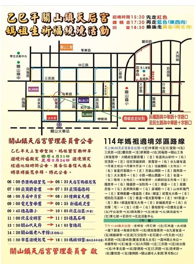 臺東縣關山鎮天后宮將於農曆三月二十四日(即21日星期一)舉辦「媽祖平安祈福遶境活動」,計有十個宮廟及十餘個陣頭參與,預估將吸引近千人共襄盛舉。臺東縣警察局關山分局積極推動社區警政,早在活動前即展開多場協調會議,秉持「交通順暢、人員安全」及「分區負責、全員機動、優勢警力」三大原則,全面規劃維安與交通疏導工作,展現警民合作,共同守護社區的力量。