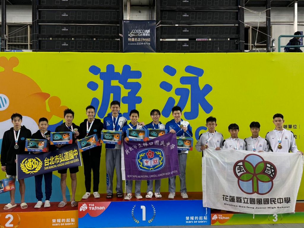 游泳池畔,國風國中男子隊蔡宜綸、韓奕焌、謝侑辰、潘彥騰在國男組800公尺自由式接力項目中,奮力游出8分01秒31佳績,為花蓮再添一面銅牌。
