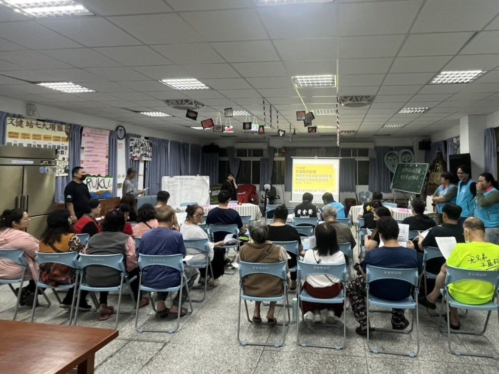 說明會詳細介紹此次新建工程內容,包含既有活動中心二樓與樓梯建築物拆除、屋頂防水與裝修工程、新建聚會所主體、機電照明、消防安全、給排水與衛生設備等系統工程,以及外部雜項與綠植景觀工程等。居民關切聚會所未來使用的安全性與文化象徵性,針對防風防雨效果、工期長短、屋頂材料、室內照明規劃、建材選用、圖騰文化意涵進行設計討論。