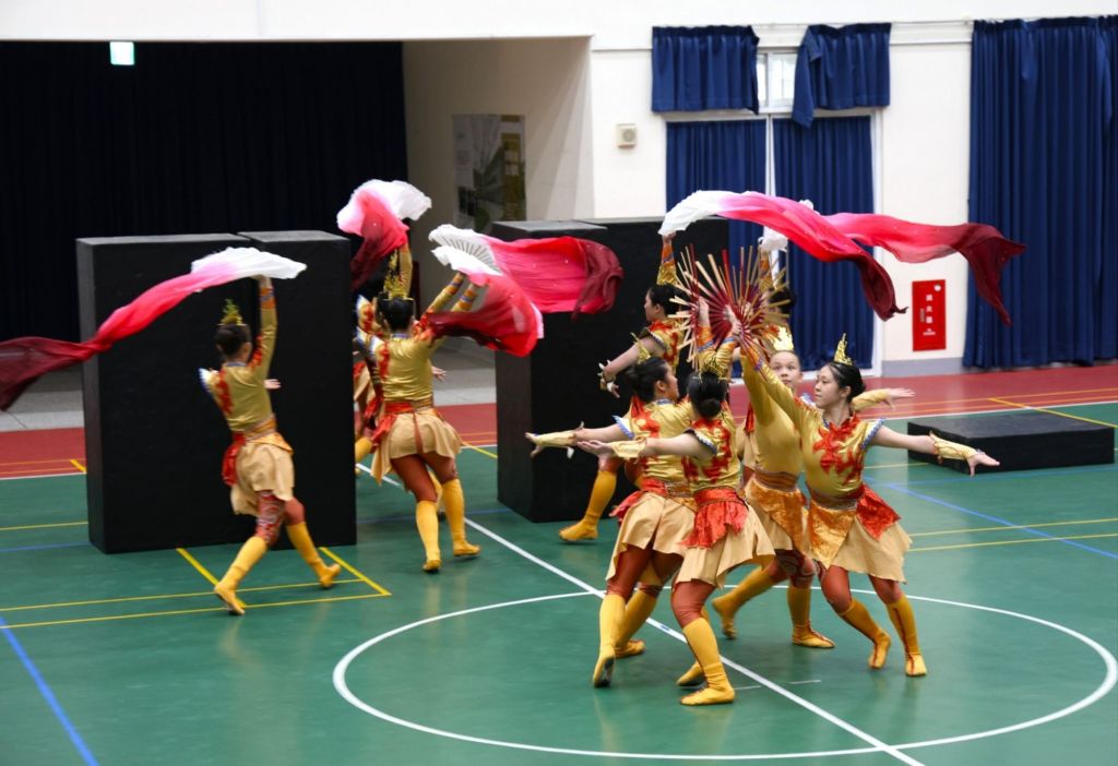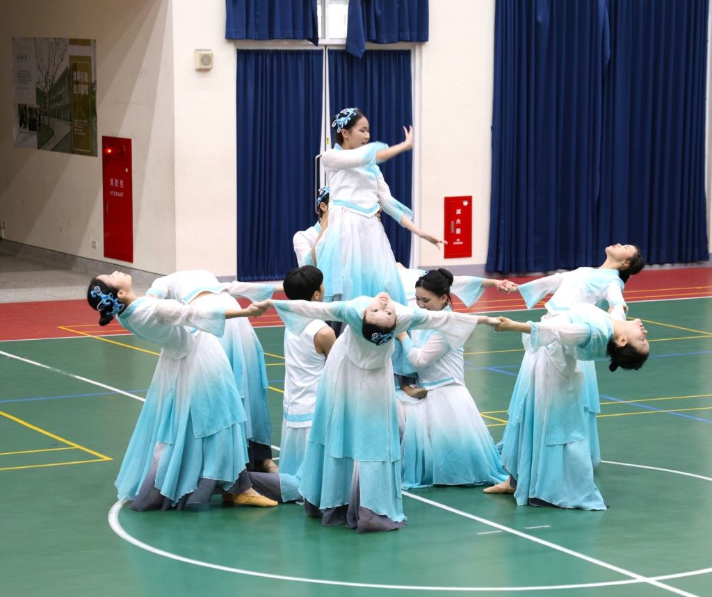 化仁國中安排了拿手舞碼「 金烏烈火焰萬丈」作為交流開場表演,猶如躍上國際舞臺般的慎重演出,從化妝、服裝到每個動作、走位、神韻…展現得淋漓盡致,其中曼妙舞姿與無間的團隊協力配合,讓現場同學和香港的友人皆讚嘆不絕。當然,英才中學也不遑多讓…紛紛展示在香港所學的身段與基本功底蘊,獲得熱烈的掌聲迴響。