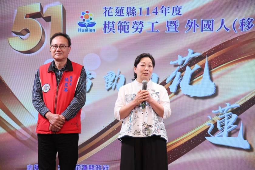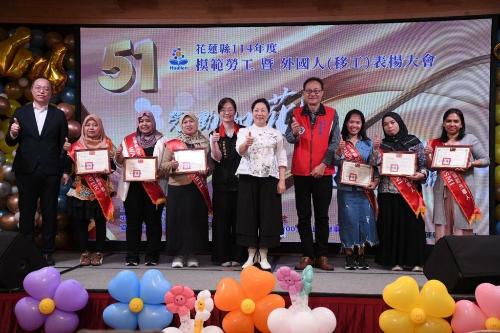 花蓮縣政府今(26)日於花蓮福容飯店舉辦「114年度模範勞工暨模範移工表揚大會」,共表揚61位本國模範勞工及6位外國模範移工(家庭看護工)。縣長徐榛蔚親自到場勉勵,並與立法委員傅崐萁一同見證勞工夥伴的傑出表現,感謝大家對花蓮產業發展的付出與貢獻。