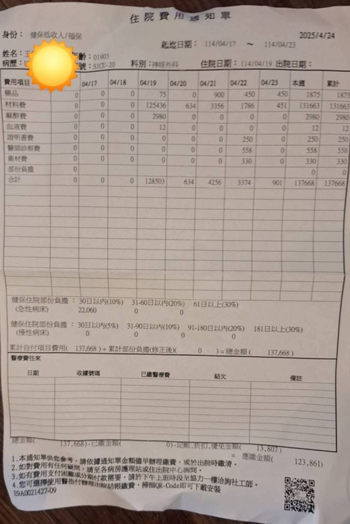 面對這麼龐大醫療費用(住院一週,費用已達13萬餘元),更別說還要擔負其父的醫療費用及家中的開支,這個的處境是如此的堅難,再此,希望社會大眾可以給予他們協助,幫幫這個家庭,拜託大家,理事長也表達由衷的感謝。