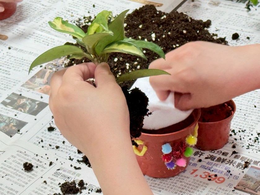 接續進入種植步驟,教學內容從放入吸水用衛生紙、鋪設培養土、移植毬蘭植株到固定位置,每個細節皆透過老師逐步示範與協助,確保每位住民都能獨立完成作品。蘇理事長也特別分享植物照護重點,包括毬蘭適合每日日照不超過四小時,以及每週澆水1至2次為宜,避免根部腐爛。