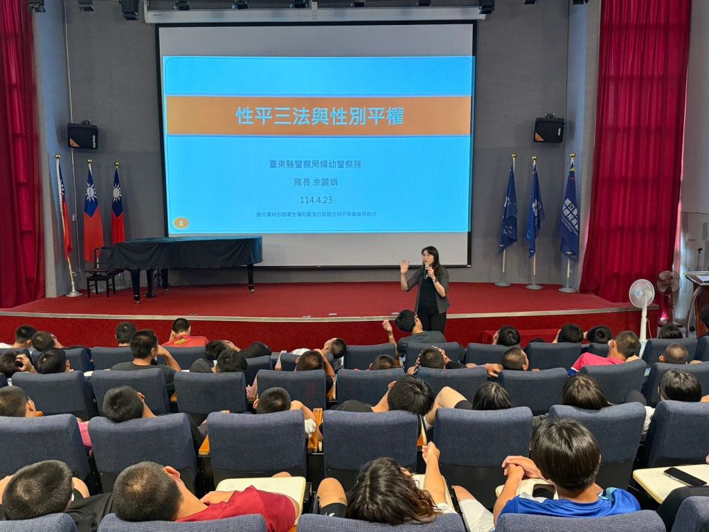 臺東縣警察局婦幼警察隊隊長余麗娟、警員張秀雯於日前受邀至國立臺東大學附屬體育高級中學進行性別平等及暴力防治教育宣導,分別針對教職員及學生講解有關性影像、兒少性剝削及性騷三法等性別暴力防治,提升學生和教師們對婦幼及性平法令的認知,同時提供相關防詐訊息,在面臨危險情境或疑似遭受詐騙時能以正確的方式來求救及查證,活動現場互動良好,氣氛熱絡,深受學校師生熱烈歡迎。