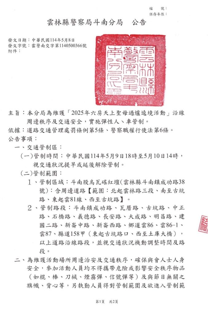 斗南警分局提醒當日參與遶境民眾,遶境時應聽從警察及廟方人員指揮,隨隊伍有序行進,配合管制區域管制及改道行駛,勿將車輛停放於禁止停車管制路段及攜帶以危害他人生命身體秩序之物品。斗南警分局祝大家吉祥平安。