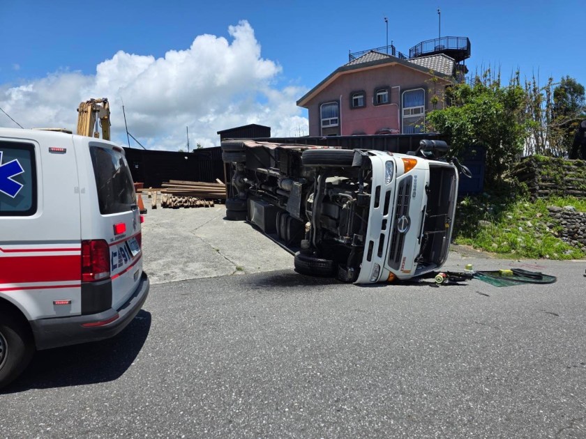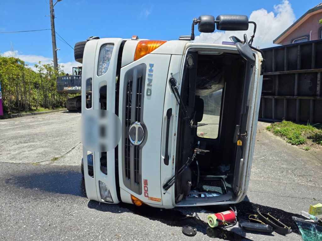 花蓮縣警察局吉安分局鹽寮派出所於(17)日中午接獲報案,在壽豐鄉鹽寮村一帶,一輛大貨車於山嶺景觀玻璃屋工地進行卸貨作業時,因地勢傾斜導致車輛重心不穩翻覆。所幸操作的黃姓男子無明顯傷勢,經救護人員現場評估後並無送醫需求。