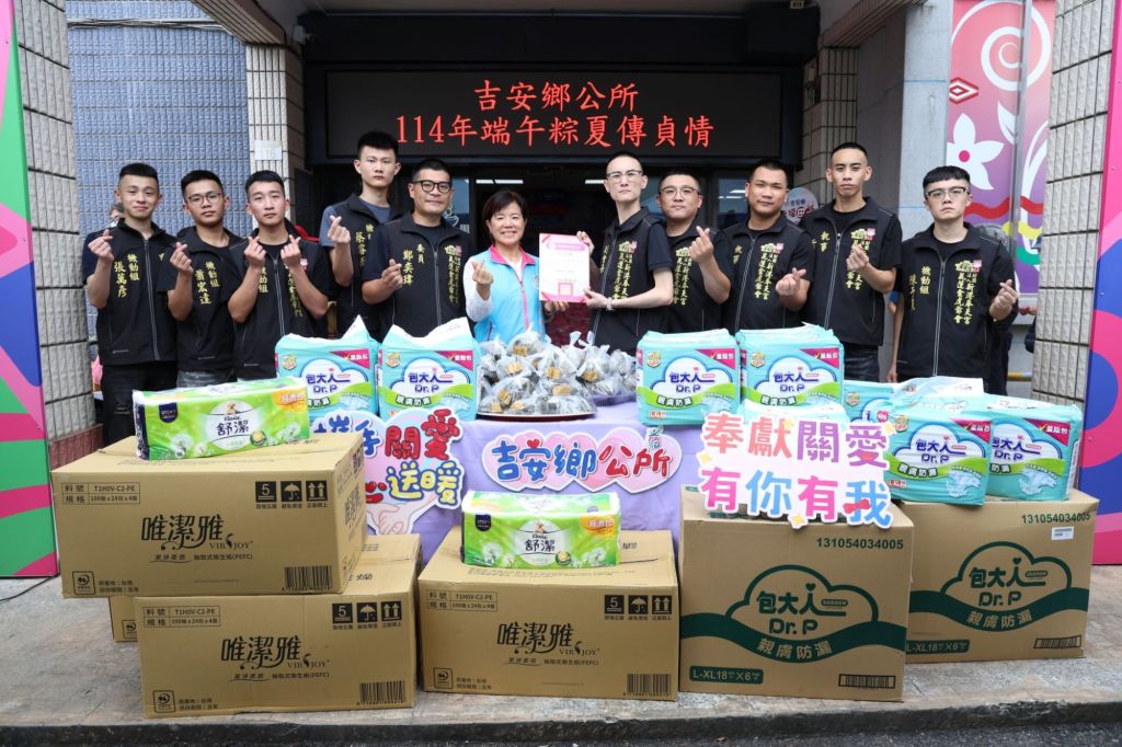 吉安鄉匯集社會眾愛,在5月24日端午佳節前夕辦理千份粽飄香~愛心傳祝福活動,募集花蓮金虎爺會三十萬善款,採購千份肉粽、衛生紙、尿片等物資,併同社會愛心捐贈的白米彙整分裝後一起發放。愛心物資發放現場井然有序,由花蓮縣金虎爺會年輕幹部成員,一份一份遞送並協助搬送上車,溫暖親力服務讓弱勢家庭有感。另善心黃春枝女士也加碼捐贈全新衣物,現場開放鄉親為自己和家人挑選合適穿搭的衣物,讓溫馨社會情藉由吉安鄉公正福利平台送暖到位。