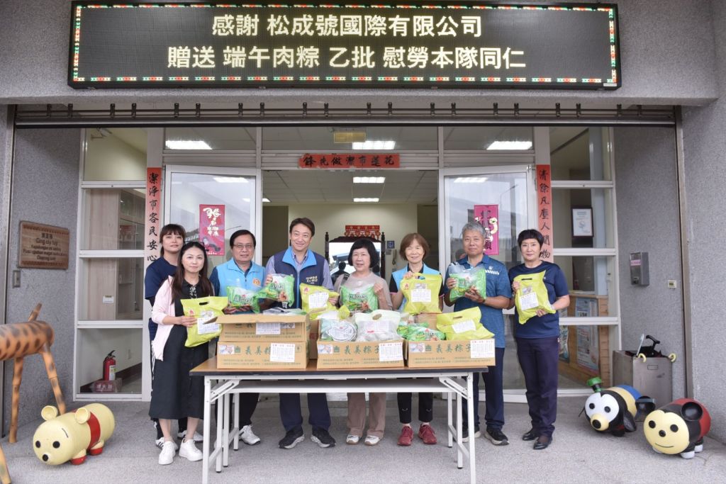 松成號國際有限公司為感謝清潔隊員的辛勞,今(29)日由董事長廖美燕代表贈送200顆肉粽給花蓮市清潔隊,花蓮市公所主任秘書翁美華代表魏嘉彥市長,與清潔隊長吳慶展一起接受這份愛心,並在議員魏嘉賢的見證下頒發感謝狀,感謝松成號長期熱心公益,以及對清潔隊員的關心。