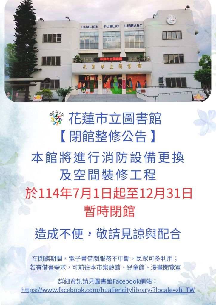 為提升市民閱讀品質與空間安全,花蓮市公所將推動市立圖書館建築改善工程,於今年7月1日啟動,預計至12月31日完工,期間將實施全面閉館,暫停臨櫃借還書及通閱服務。