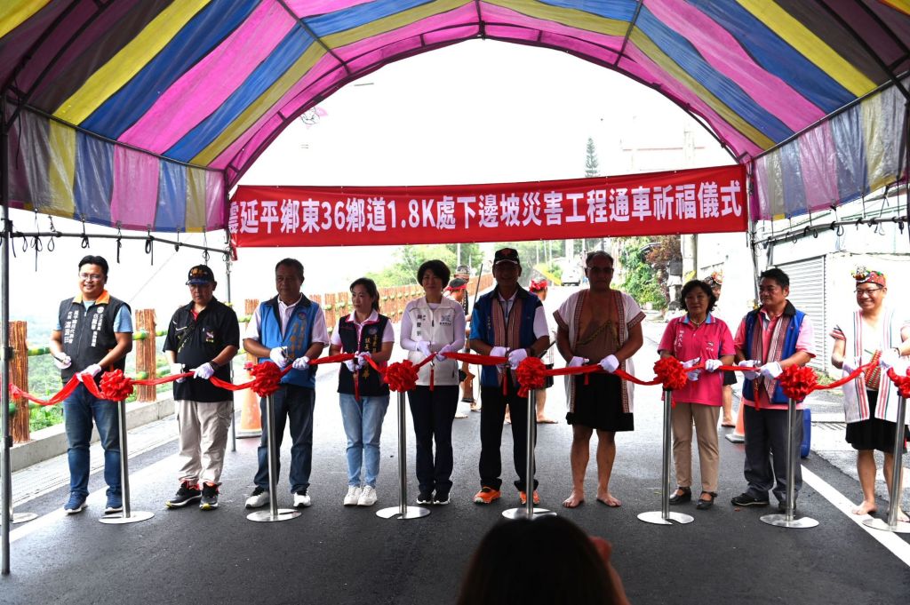 臺東縣延平鄉對外聯絡重要交通幹道之一的「東36鄉道1.8K處下邊坡災害工程」完工,臺東縣政府特別於今(4)日舉行通車祈福儀式,縣長饒慶鈴表示,此路段在111年0918地震時受損嚴重,經縣府積極爭取經費並歷經施工,如今正式完工通車,恢復延平鄉對外聯絡的重要生命線,確保民眾交通順暢與生命財產安全。
