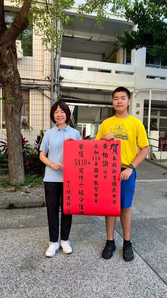 教育處蔡美瑤處長昨(9)日傍晚親赴新生國中,頒發紅榜表揚兩位學術表現優異學生,鼓勵他們持續懷抱學習熱忱、勇敢追夢。同時也勉勵全縣各校師生,持續努力提升整體學力,追求更優異的成果。