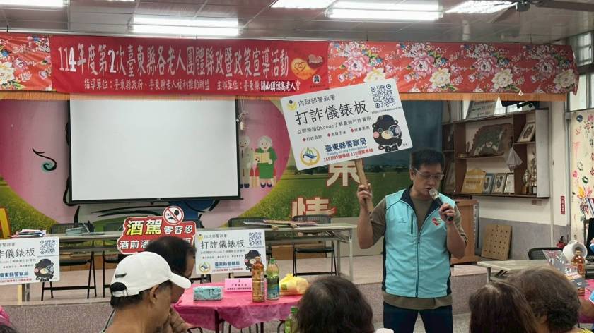 為提升長者防詐意識及交通安全觀念,臺東縣警察局關山分局於今(12)日受邀至「114年第2次臺東縣各老人團體縣政暨政策宣導活動」中進行專題宣講。活動於關山鎮德高里北庄活動中心舉行,由德高老人會理事長范江東主持,縣議員陳宏宗亦列席關懷長輩,現場聚集來自臺東市、大武、成功等鄉(鎮)市逾百位長者,不畏大雨共襄盛舉,反應熱烈。