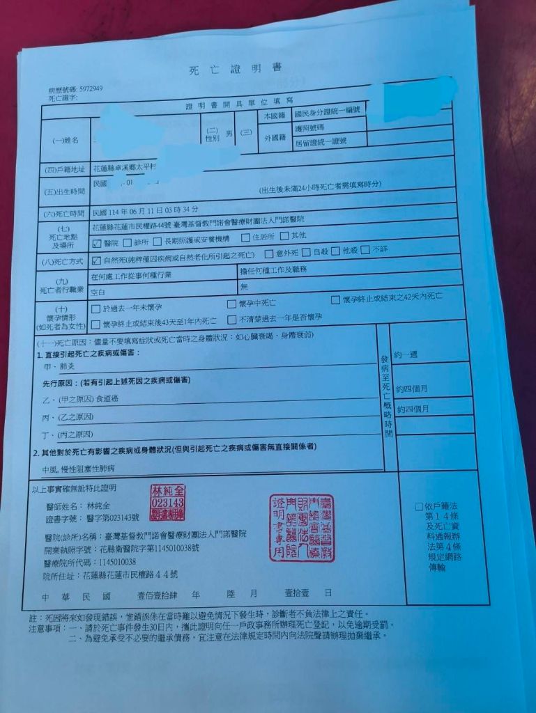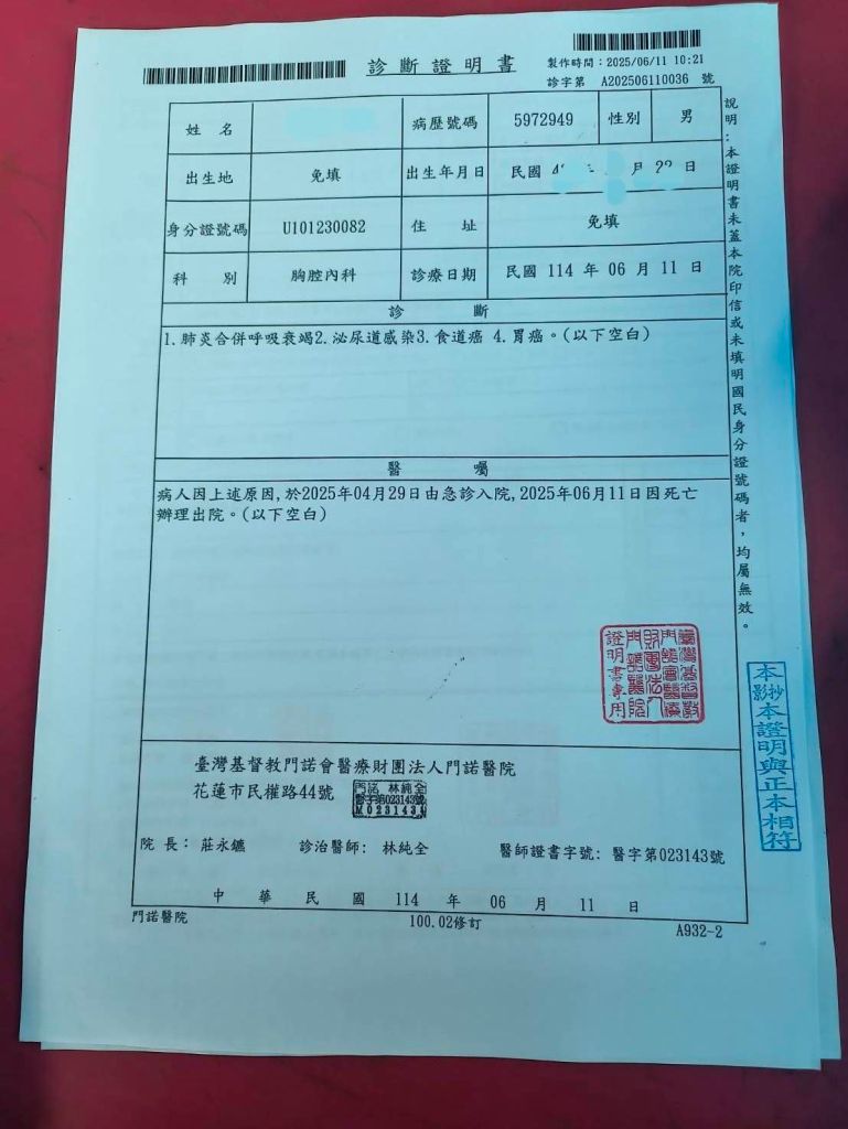在2月份,協會理事長曾到過王老先生的家去訪視,得知他因病導致左半身中風,有嚴重的氣喘,並患有食道癌及胃癌,協會先行幫助王老先生及太太申請低收入戶,然而在3月,經花蓮縣政府准予核定,另進行協助王老先生申請製氧機,孰知剛獲得低收資格,惟尚未募得製氧機,老先生卻在4月29時,因身體不適,又入住慈濟花蓮總院,但這一次一住,便是離開了人世,實在令人錯愕。王老先生,因肺炎,於民國114年6月11日03時34分,病死院中,享年71歲。