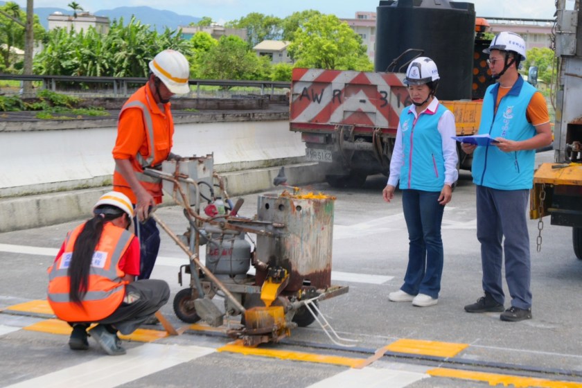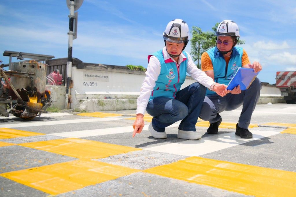 鄉長游淑貞率團隊前往施工現場勘查,並與施工單位多次確認標線配置與施作品質。她表示,七腳川溪在縣鄉協力整建完成後,已成為在地早晚步行運動的重要場域,日常行人與車輛交會頻繁,且常有駕駛人因路口未減速及車速過快情形發生,多次造成行人驚險通行情況。此次標線施作採用高辨識度的黃色,並特別加入玻璃砂塗料,除具備反光功能外,也能有效增加路面粗糙度,提高止滑效果;且抗滑係數需達到50 BPN以上,以確保無論晴天或雨天,行人皆能安全通行。