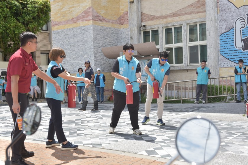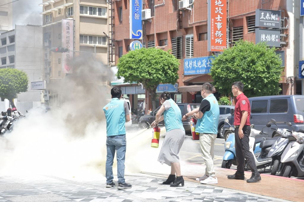 此次演練中,消防局花蓮分隊教導市公所同仁正確使用滅火器,現場並安排實際操作。消防人員詳細說明「拉、瞄、壓、掃」的操作口訣外,也提醒大家操作時應站在上風處、距火源約一至三公尺,並注意滅火器的噴射時間僅約十秒,適用於初期火災,一旦火勢擴大則應立即逃生並通知消防單位。