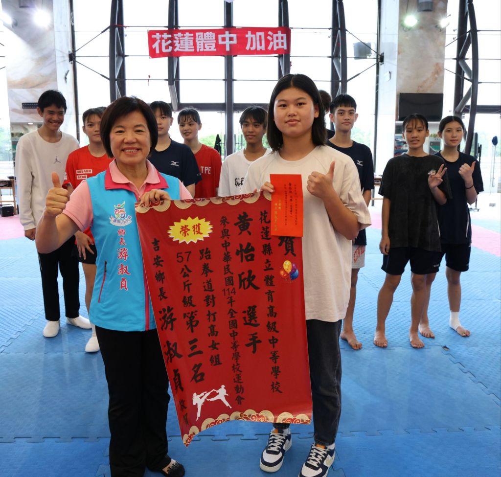 鄉長游淑貞分別頒贈黃安、黃怡欣獎勵金,並欣喜的說:吉安的孩子們能在全國競賽場上嶄露頭角,不僅是學校的榮耀,也是花蓮的驕傲。機會是留給準備好的人,期許孩子們不怕苦、不怕累,勇敢追夢!期許再接再厲,祝福未來成為國際賽事中的閃耀之星!