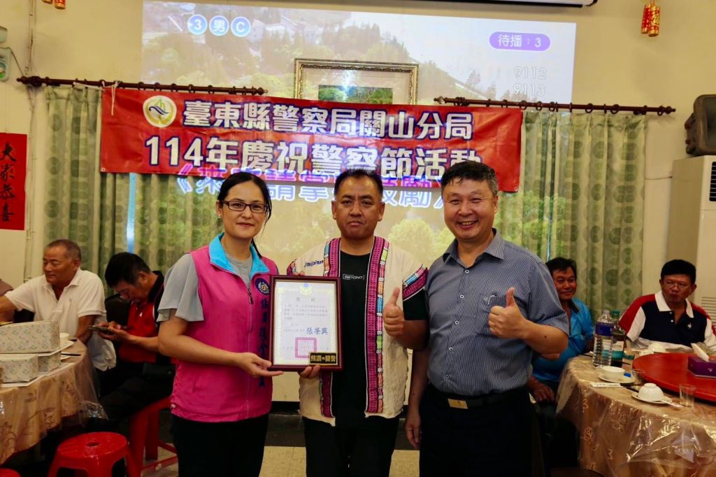 為表彰同仁平日辛勞與傑出表現,於會場公開表揚警察局114年度績優員警,頒發刑事楷模黃福昇、交通楷模吳柏義、為民服務模範凃博禹、失蹤人口查尋績優警員余剛,以及綜合表現傑出的魏子翔、邱麗香與羅曉薇等七位優秀同仁,分別獲得獎牌乙面及禮券,並由與會貴賓親自頒獎,象徵榮耀與肯定,也激勵所有警察持續精進、再創佳績。臺東縣議員陳宏宗於會中致詞指出,關山警分局是一支穩健而優質的團隊,長年守護地方治安與交通安全,績效有目共睹,值得全體民眾肯定與感謝。警察之友會理事長陳義文則表示,警友會與在地各站將持續作為警察堅實的後盾,全力支持警政發展,讓治安網絡更加綿密,民眾更有安全感。