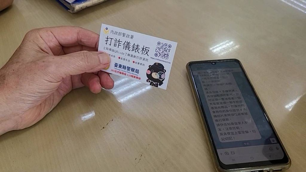「這是詐騙的嗎?」住在臺東縣關山鎮的72歲陳姓老翁,於今(21)日8時30分許,神情慌張地走進臺東縣警察局關山分局關山聯合所,向值班警員李雅筑展示手機訊息,內容是其孫子轉傳的一段提醒文字:「臺灣盛產的又換一種新詐騙方式了!他們會先在超市門口…請你掃描行動條碼…憑身份證+手機號碼,再錄個點頭的影片…用你的身份證號+手機相片…進行貸款」。陳翁擔心自己曾經遭遇類似情形,急忙向員警求證。