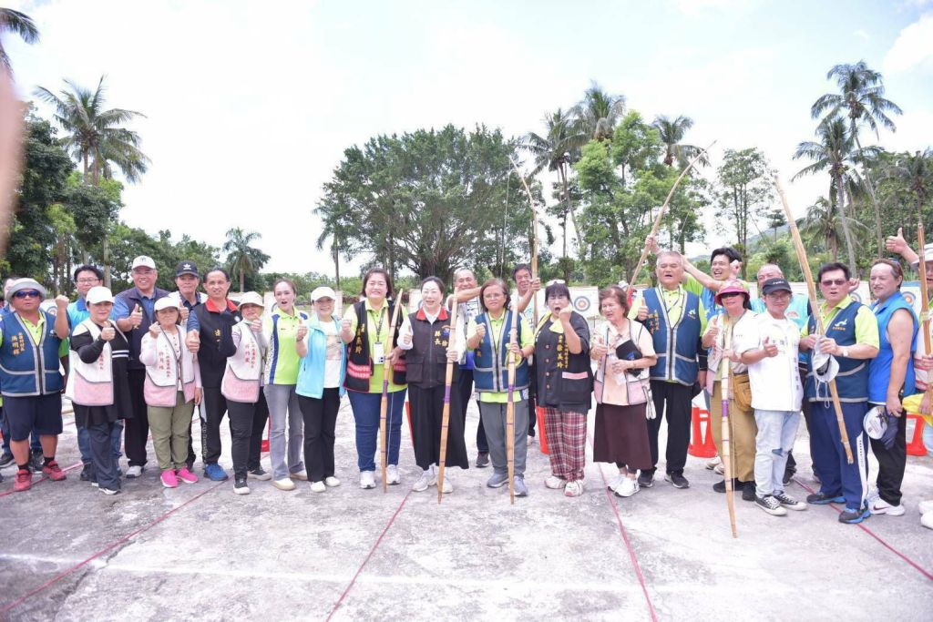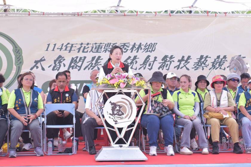 「114年花蓮縣秀林鄉太魯閣族傳統射箭技藝競賽」今(21)日在水源村東方夏威夷遊樂園舊址盛大登場,縣長徐榛蔚在秀林鄉長王玫瑰、代表會主席駱燕玲、多位村長、耆老及部落事務組長代表陪同下出席開幕活動,一同完成開弓儀式,宣布賽事正式展開,並為場上參賽選手加油打氣。