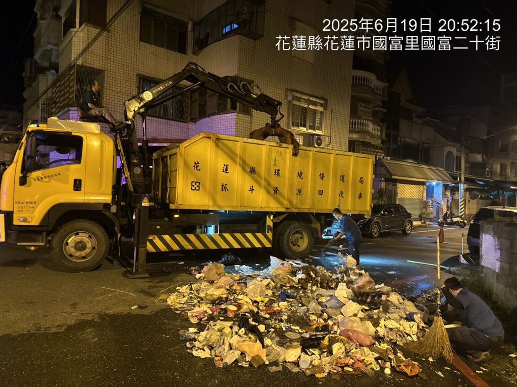 花蓮市公所清潔隊19日夜間於例行垃圾收運勤務途中,垃圾車在壓縮垃圾時,車內突然冒出濃煙並發出悶燒氣味,情況十分危急。清潔隊員第一時間立即將垃圾倒出,並迅速使用滅火器進行初步處置。消防局自強分隊隨後趕抵現場協助,所幸火勢於短時間內獲得控制,未造成人員受傷或設備損毀。