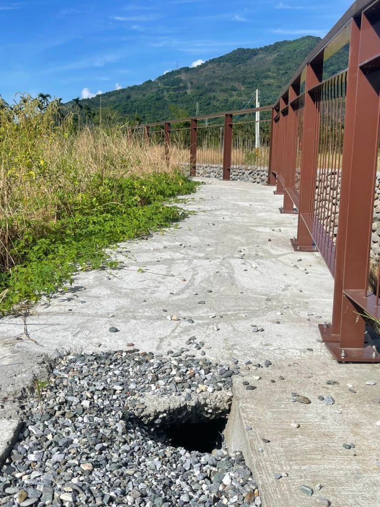 近日花蓮地區連日豪大雨,此工程竟不堪雨勢摧殘,現場千瘡百孔,自行車道雜草叢生,護堤砌石崩塌,車道基底掏空陷落,造成多處大坑洞,導致多位行人不慎跌倒受傷。遊客與在地鄉親痛批:「花了那麼多公帑,經不起幾日雨,這還叫水環境改善?」楊姓居民也表示每日都會到濕地散步,也因為自行道的長草與坑洞導致跌到受傷。