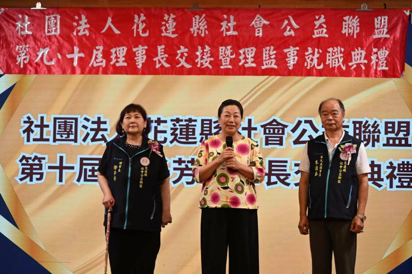 社團法人花蓮縣社會公益聯盟昨(22)日晚間於花蓮福容大飯店舉行「第九、十屆理事長交接暨理監事就職典禮」,花蓮縣長徐榛蔚、立法委員傅崐萁、縣府社會處長陳加富、吉安鄉長游淑貞出席典禮致意。徐縣長感謝社會公益聯盟的服務精神以及對社會的貢獻,並致贈「溫潤如玉」版畫予新任理事長徐子芳,以及「玉見台灣」版畫予卸任理事長朱連春,感謝公益聯盟為社會造福,為社會帶來正向力量。