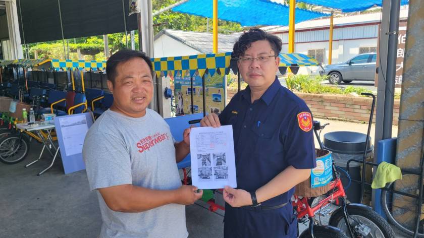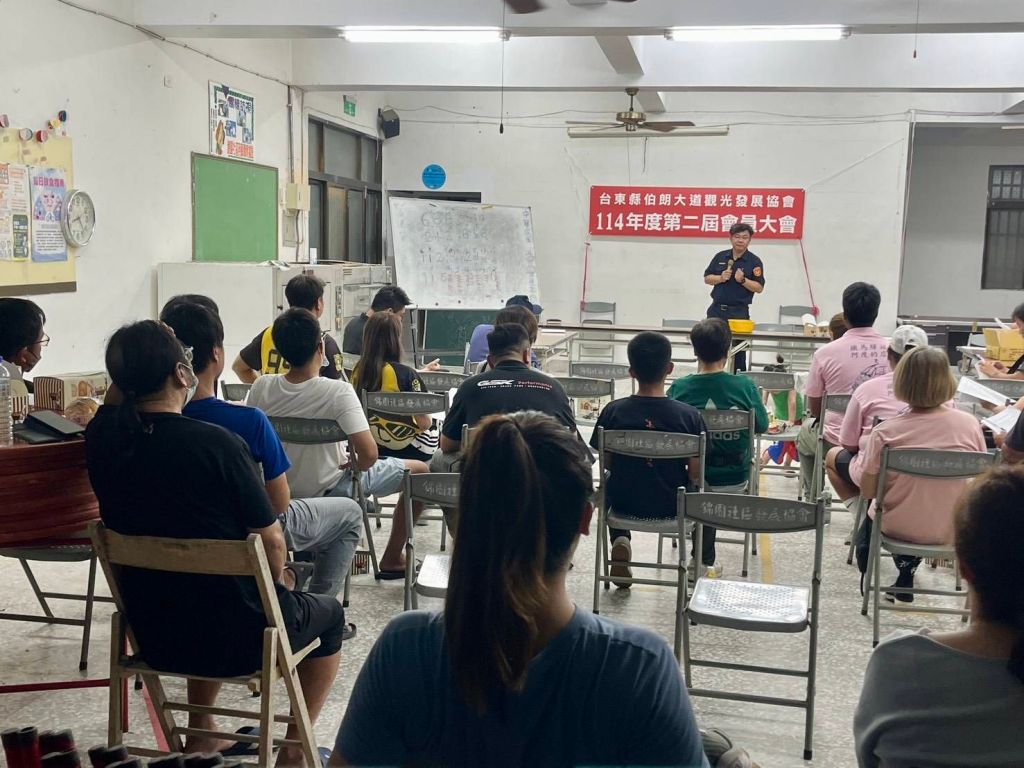 臺東縣警察局關山分局錦安派出所副所長楊登基,於昨(23)日19時30分,應臺東縣伯朗大道觀光發展協會之邀,出席此會辦理的「114年度第二屆會員大會」,向在場業者說明將於今(24)日正式施行的《臺東縣三輪以上營業用慢車登記管理辦法》,並於今(24)日上午向業者持續宣導,呼籲業者配合規定,共同營造安全且有保障的觀光環境。