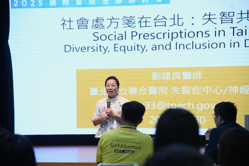 臺北市立聯合醫院和平婦幼院區神經內科主任劉建良醫師以社會處方箋在台北:失智共融處方為題,闡述長照2.0服務項目、重要方案及計畫,跨部會合作、落實失智綱領、建構失智整合照護網並分流連續性照護資源,以及納入社會處方籤,藉由服務聯繫滿足患者的健康、幸福感及社交情感需求。