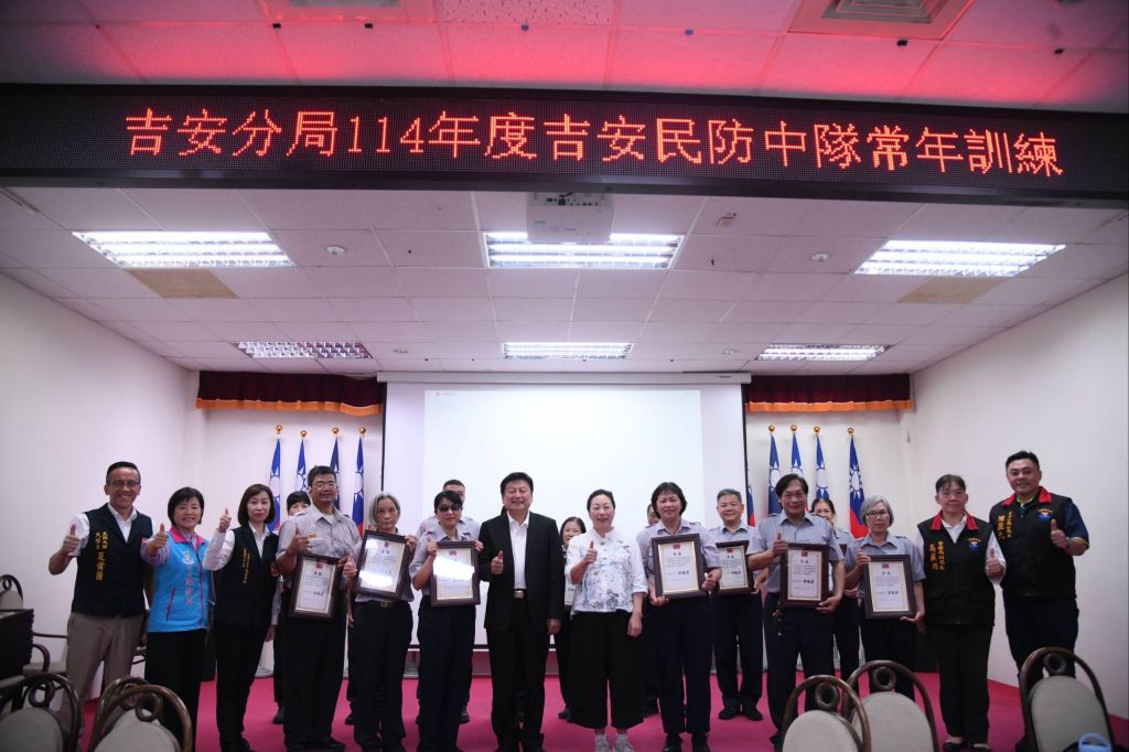 花蓮縣警察局今(30)日舉辦吉安民防中隊常訓,縣長徐榛蔚親自到場,與立法委員傅崐萁、吉安鄉長游淑貞、花蓮縣警察局副局長高麗姬、吉安警分局長陳盈元、花蓮縣民防大隊大隊長巡守大隊長夏貴勇、中隊長范姜幸玲一同出席,親自為辛勞奉獻的民防巡守隊員打氣,並頒贈榮譽獎狀,感謝大家長年以來默默守護家園、維護社區安全。