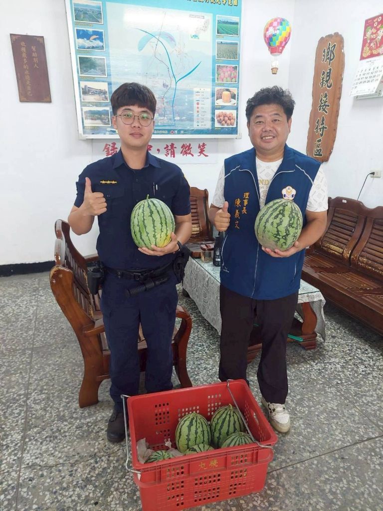 臺東縣警察之友會理事長陳義文於今(2)日9時,特地親自送來兩大籃「大粒水多」的西瓜,至臺東縣警察局關山分局鹿野分駐所,為頂著炎炎烈日,辛勤執行治安、交通、為民服務,以及即將於7月5日到來的「臺灣國際熱氣球嘉年華」勤務的基層員警打氣。讓同仁們在外勤執行任務返所後,能立即享用冰涼消暑的西瓜,降溫解渴,也補充流失的水分,提升後續勤務的精神與體力。