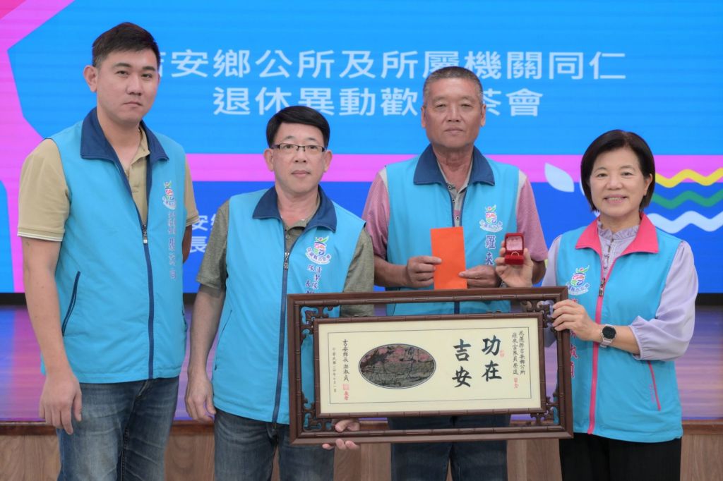吉安鄉公所鋼鐵團隊平時致力推動鄉政、落實各項基礎建設,更是互相關懷扶持的大家庭;日前在親民堂舉行溫馨感恩歡送餐會,歡送於七月份退休的主秘高文彬、清潔隊員羅來富與黃千維等三位同仁,同時祝賀李亭賢與吳融沛兩位同仁榮調他單位。昔日攜手完成服務任務的夥伴們紛紛獻上祝福,讓榮退與榮調的同仁們都充分感受到家人般的情誼。鄉長游淑貞也特別頒贈「功在吉安」退休匾額、玫瑰石匾、紀念品等溫馨禮物,由衷表達感謝過去在各崗位中,全心全力服務鄉親,讓公務變得更有溫度,更祝福退休後的全新人生旅程平安快樂。