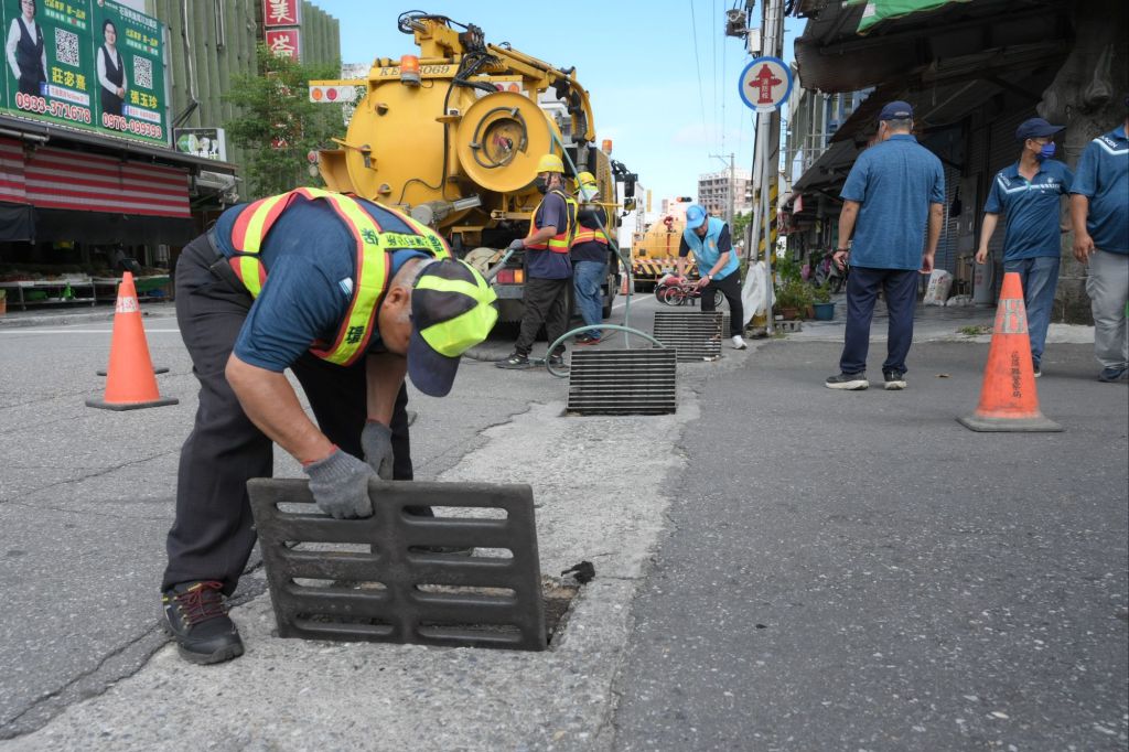 為防範颱風雨勢,花蓮市清潔隊加強排水溝清疏作業,由清潔隊員於重點區域操作清溝車,搭配高壓水管、高壓噴頭及高壓清洗機等機具,將水溝裡的油汙、淤泥、草木枝葉、營建廢棄物、家用垃圾及塑膠袋等物品清除,防止道路側溝堵塞,雨水宣洩不及形成積淹水等災害。