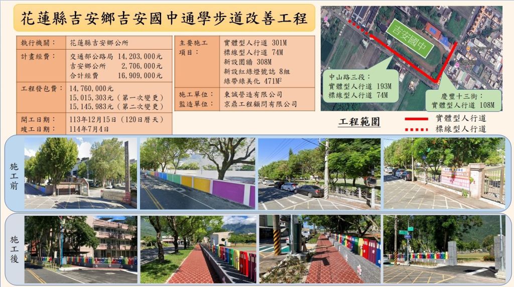 建設課表示,吉安國中原周邊的校門圍牆與車道相距僅1公尺,學生上下學時需與車輛爭道,存在極大安全隱患。此次工程感謝校方配合退縮學校圍牆4到5公尺空間,完成增設中山路三段193米實體型與74米標線型人行道、還有慶豐十三街的108米實體型人行道,也加強路面防滑係數要求,另外,關於綠帶綠美化471平方米、以及車輛通行與行人專用號誌、造型圍牆、改善路燈、交通號誌等相關設施,均已完工。相信未來不僅學生安全得到保障,家長接送孩子也更為便利。