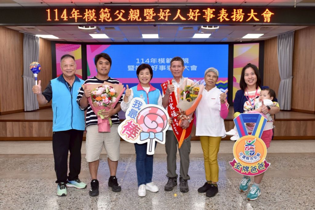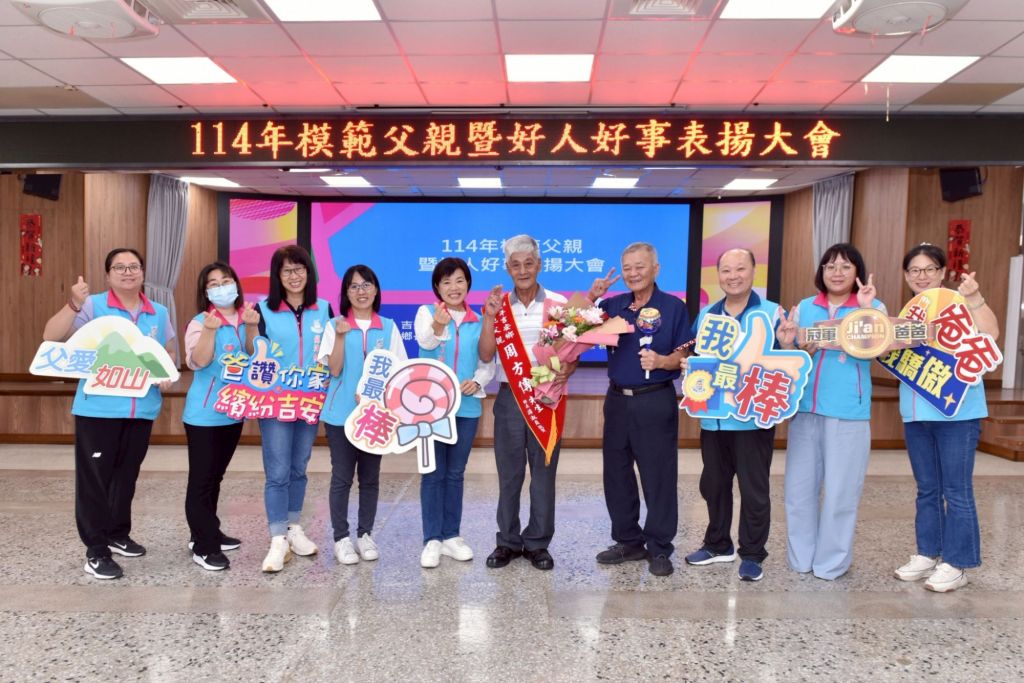 「我的爸爸是座山!」父親節將至,吉安鄉公所將於8月8日下午在福容大飯店舉辦「114年度模範父親及好人好事表揚大會」,表彰默默付出的爸爸們與行善典範。為定格這份榮耀與感動,鄉公所日前特別安排模範父親與好人好事代表共34位,於親民堂與鄉長、村長及家人合影留念,記錄下難得的溫馨時光。鄉長游淑貞發揮創意,親手致贈每位爸爸一根象徵父愛如山、甜蜜無窮的「巨型棒棒糖」,期盼他們將幸福分享給家人,也誠摯邀請親友共襄盛舉,向這些如大樹般守護家庭的父親們致敬。