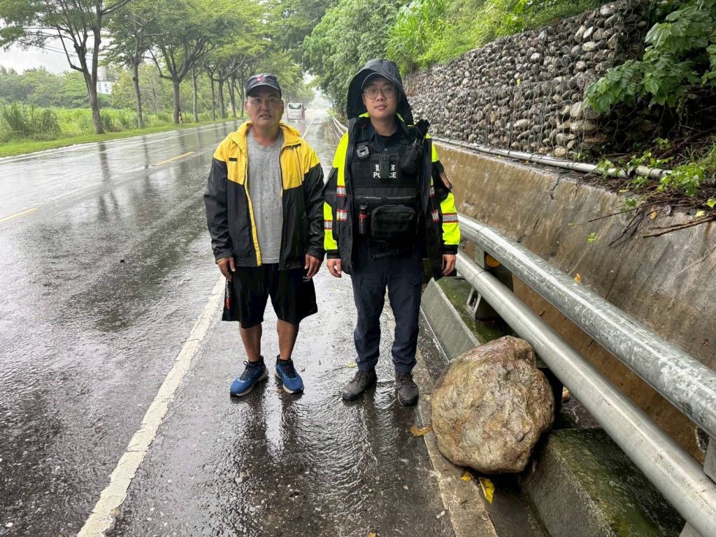 臺東縣鹿野鄉臺9線339.5公里處(鹿鳴段),於今(11)日7時5分許,發生落石影響交通情形,經熱心民眾通報後,臺東縣警察局關山分局鹿野分駐所立即派遣員警前往現場處置,順利排除障礙,確保用路人行車安全。據悉,當時有3塊大小不一的落石出現在車道中,其中2顆為體積較大的岩塊,阻礙來車通行,對交通造成潛在危險。鹿野分駐所獲報後,派遣巡邏警員簡士瑋及馮文威火速趕抵現場,與現場熱心民眾合力將落石移置至路旁安全處,並擺放交通錐警示來車,以防二次事故發生。