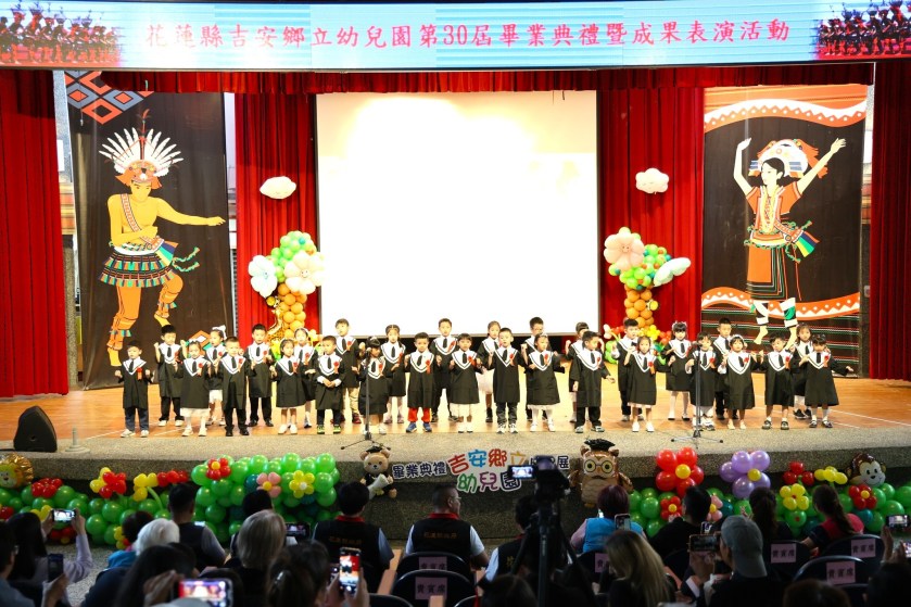 吉安鄉立幼兒園日前在阿美文化館舉辦第30屆畢業典禮,為今年30位畢業生精心安排精彩展演活動,小寶貝們以國、客語致畢業感恩詞,搭配原住民舞蹈、舞台劇及合唱等多元才藝串聯,展現豐富的學習成果,贏得全場來賓與家長們掌聲不斷。