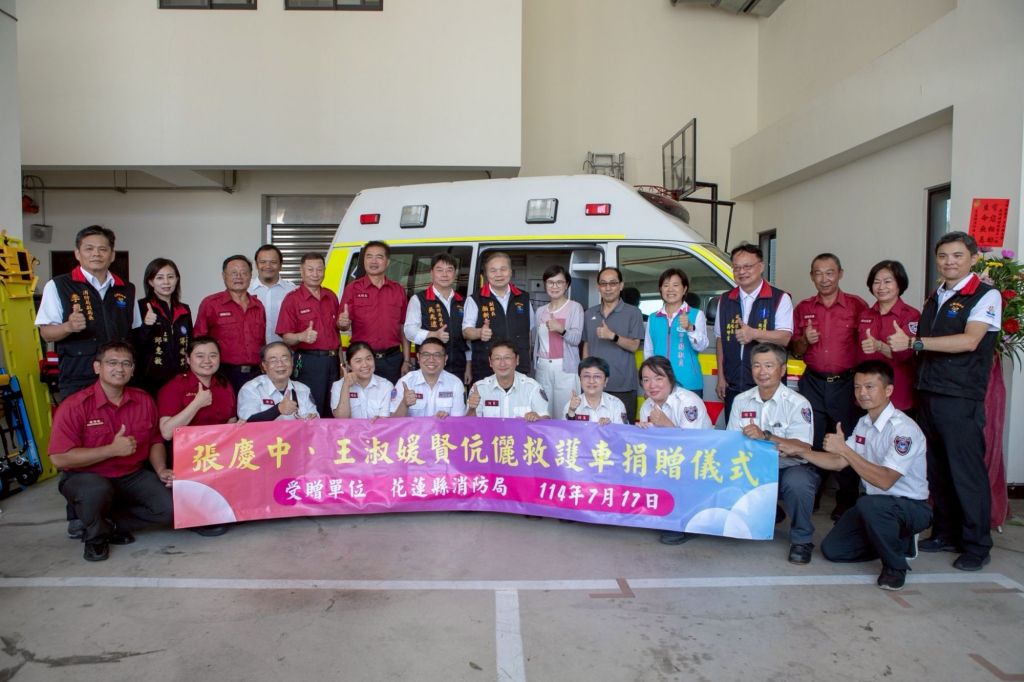 近年花蓮天災頻傳,來自桃園市楊梅區的王淑媛女士有感於花蓮消防同仁救災辛勞,同時王女士的母親也因家人曾有多次呼叫救護車送醫的經歷,所以抱著感恩的心,除了感謝救護人員外,也希望幫助同樣跟時間賽跑的民眾,另母親因年事已高不便於行,無法親臨現場,因此為完成母親捐贈救護車之心願,張慶中、王淑媛伉儷特捐贈高性能救護車一輛,並以母親(王楊月霞女士)的名義捐贈予花蓮縣消防局,相信這輛救護車不僅會載著醫療器材與病患,更會載著無數人心中的希望與溫暖,也期許能藉由救護車輛及裝備的挹注,提升偏鄉的醫療資源,讓花蓮縣民獲得更優質的急救品質,現場由副縣長顏新章代表受贈,並回贈救護車模型與感謝狀,場面溫馨且隆重。
