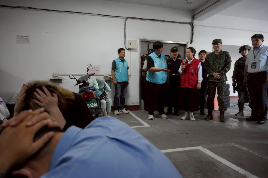 花蓮市公所建物共三層樓並設有一層地下避難空間,平時即由民防團編組疏散避難小組,並定期進行演練與教育訓練。今日的演習中,若有行動不便、身體不適者,則由公所人員協助就地尋找安全掩蔽物,遵循「遠離窗戶、兩道牆原則」,確保即時保護每一位民眾的安全。