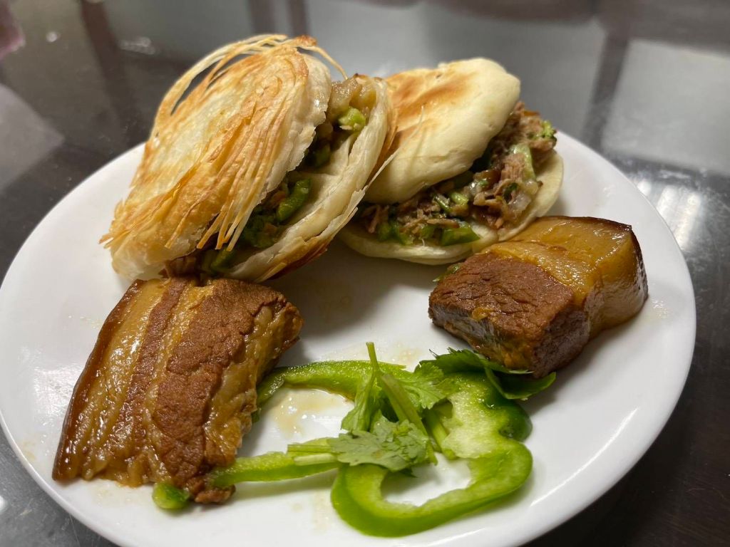 紅麗老師接著介紹陝西平民美食肉夾饃,種類繁多,包括白吉饃、肉臊子夾饃、老潼關肉夾饃等,其中老潼關肉夾饃發源自陝西潼關縣,餅皮講究酥脆分明,咬下去會掉渣,但內部鬆軟。至於肉餡則是用乾辣椒、花椒等辛香料慢火滷製,肥而不膩,瘦而不柴,鹹香可口。她更提到,自己來臺後為了找回熟悉口感,曾反覆嘗試各種麵粉比例與火侯調整,歷經兩個月後終於成功,如今樂於將這份家鄉味傳給更多朋友。此外,紅麗老師也進一步與在場學員交流在臺生活適應經驗歷程,從語言挑戰到文化融合的點滴,都引起在場共鳴,讓大家紛紛表示今日參加課程活動獲益匪淺。