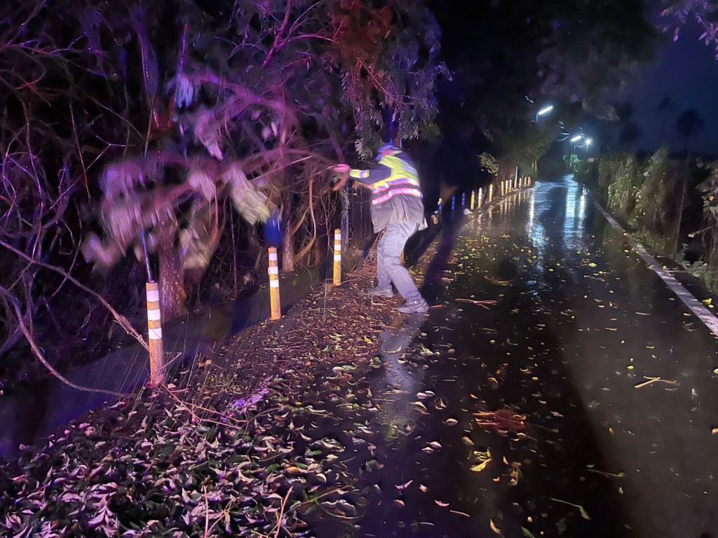 近日受西南氣流影響,屏東地區降下連續豪雨,為即時掌握轄區內可能因強風豪雨所造成的災情,屏東縣政府警察局里港分局鹽埔分駐所所長王承修與警員孫建明於7月29日18時許執行晚間巡邏勤務時,特別針對易積水路段及偏遠地區加強巡視。當巡經高朗村民治路段時,發現一棵路樹疑似不堪連日風雨侵襲,樹枝斷裂垂掛至馬路中央,不僅影響通行視線,更可能危及行車與行人安全。
