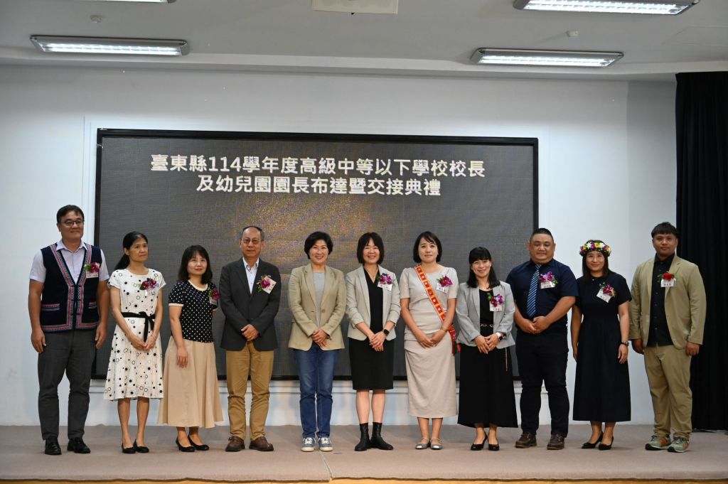 臺東縣114學年度高級中等以下學校、幼兒園校長及園長布達暨交接典禮,今(31)日在縣府大禮堂舉行,由縣長饒慶鈴親自為15位連任國中小校長、14位轉任、7位新任、2位續任,以及1位新任幼兒園園長頒發聘書,也感念寶桑國中游數珠校長、鹿野國中李紹平校長、南王國小洪志彰校長、蘭嶼國小夏曼.威廉斯校長及大南國小朱慧清校長等5位退休校長,多年來在教育第一線的堅持與努力,並致贈紀念品。她表示,為滿足學校多元需求,臺東縣政府持續補充教師人力,今年度教師聯合甄選涵蓋多類教學領域,共有95位生力軍加入,期待大家堅守教育初心,為臺東教育注入更多創新活力。