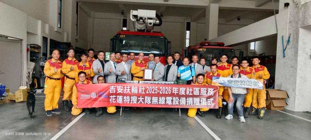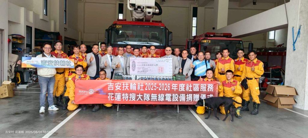 捐贈儀式於花蓮縣消防局特搜大隊舉行,由吉安扶輪社社長張俊明代表捐贈,並由義勇消防總隊特種搜救大隊代表受贈。社長張俊明致詞時表示:「義消人員平日默默投入災害搶救,無懼艱難,是守護地方安全不可或缺的重要力量。扶輪社期盼透過此次捐贈,為特搜義消弟兄姐妹的通訊裝備升級,提供更堅實的後盾。」