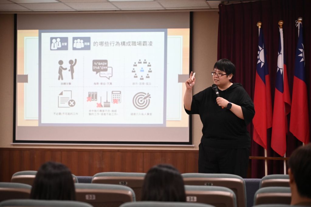 講座中,黃愛珍講師以其法律專業背景,並結合其多年教學以及實務經驗,針對性騷擾與職場霸凌的定義、類型、處理程序及申訴管道進行詳盡說明,並以新聞案例與影片輔助,引導同仁深入理解職場中常見的隱性暴力型態與應對方式。
