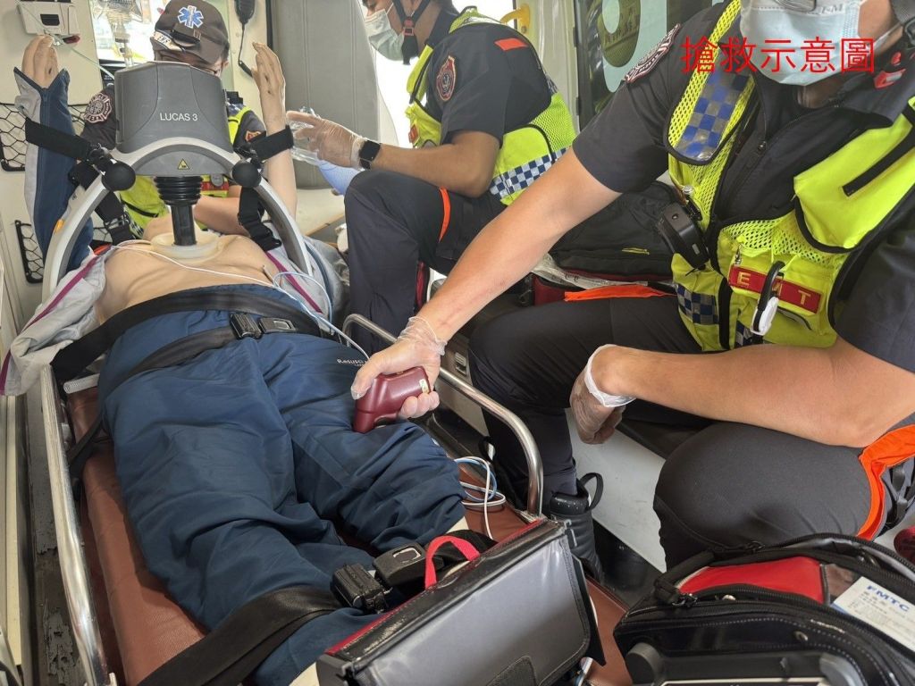 據工地人員表示,劉先生當時正在進行施工作業,突然倒臥於管線區域,無法喚醒,隨即撥打119求援。救護人員抵達後,立即將患者移至安全位置,實施高品質CPR、使用AED分析心律,並進行氣管插管、建立骨針給藥通路,施打腎上腺素等完整的高級心肺復甦術(ACLS)流程,最終成功挽救生命。
