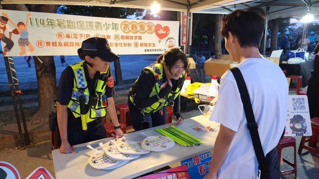 日前受薇帕颱風外圍環流影響,原訂於7月24日(四)舉辦的「池上大坡池光雕音樂會」,因連日降雨導致場地泥濘而延期至8月11日(一)晚間盛大登場。臺東縣警察局關山分局為確保活動安全與順暢,於當日16時起由分局長龔士哲親自坐鎮現場指揮,執行維安與交通疏導勤務,並在機動派出所由池上分駐所所長蔡欣妤及交通組巡佐林張仲康,結合暑期青春專案,向遊客宣導「打詐儀錶板」(https://165dashboard.tw/)、酒駕零容忍及路口慢看停等觀念,並透過有獎徵答與民眾熱烈互動,讓防詐與交通安全知識深植人心。