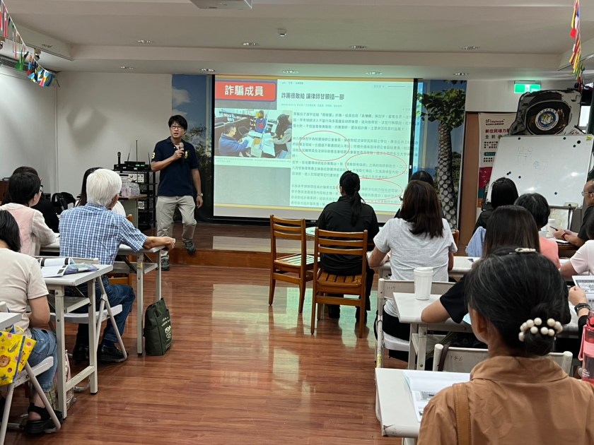為加強新住民防詐意識,此次特邀臺灣宜蘭地方檢察署主任檢察官陳怡龍,向志工通譯以及移民署同仁介紹新世代打擊詐欺策略行動綱領2.0,強化「識詐、堵詐、防詐、阻詐及懲詐」五面向防護網,並特別著重於「識詐」面的教育宣導。從內政部公布之打詐儀表板數據呈現,介紹詐騙當前實務狀況案例分析、歸納常見詐騙類型為投資詐騙、網路購物詐騙及解除分期付款詐騙。宜蘭縣7月份詐騙案件受理數289件、財產損失金額達1億5,108萬,詐騙觸角已延伸至民眾生活中,騙取金錢、帳戶資料甚至透過盜取FB、Line帳號擴散觸及率;陳主任檢察官提到詐騙集團猖獗,甚至連宜蘭地院主管群組也遭滲透,透過傳送看似日常無害的友人小孩衝票數點擊連結,盜取群組成員的Line帳號,發送借款訊息,而使得主管群組也得被迫解散重組。詐騙集團常利用人性的好奇心或不甘心、不相信自己被騙,以為再付一點錢就可以成交等等先詐騙再恐嚇話術手法,利用一般人在資訊不對等、恐懼或驚嚇慌亂的情形下,完成詐騙。