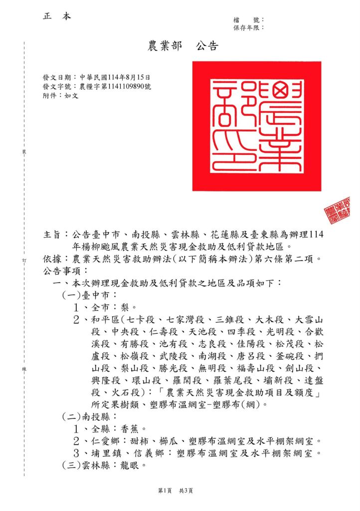 農業部今日公告現金救助-台東縣「農產業全品項(稻米除外)」,且香蕉、文旦柚、番荔枝(鳳梨釋迦、釋迦)及番石榴救助,經農業部114年4月18日種植客觀證明文件,得「免勘查」。公告「全縣全品項」才能避免協助農民過程中發生任何疏漏。陳瑩表示,農損救助相較於一夕全毀的作物,只是減少農民損失,讓農民稍微喘口氣,能繼續努力復耕。