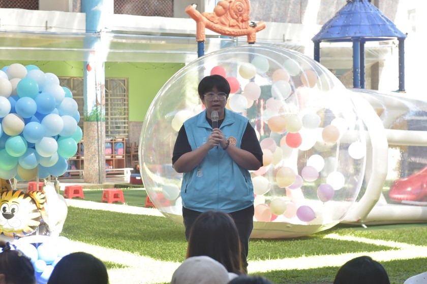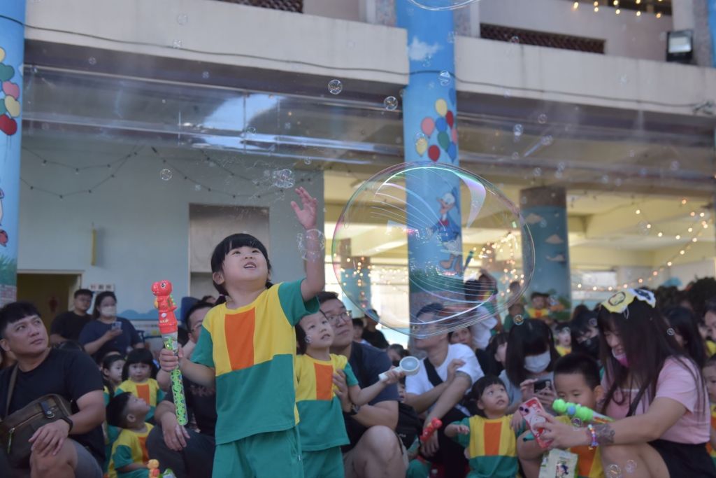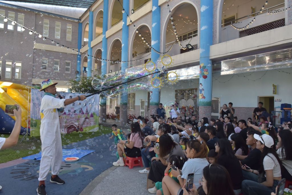 緊接著打扮成海葵的「海葵先生」帶來氣球互動表演,不僅有精彩的特技演出,還與孩子跟家長進行舞台互動,讓大家都捧腹大笑;接著登場的是孩子最期待的泡泡派對,新生們陸續體驗各種泡吹泡泡的裝置,七彩的泡泡在陽光下飛舞,小朋友們都忍不住歡呼並追趕著泡沫。
