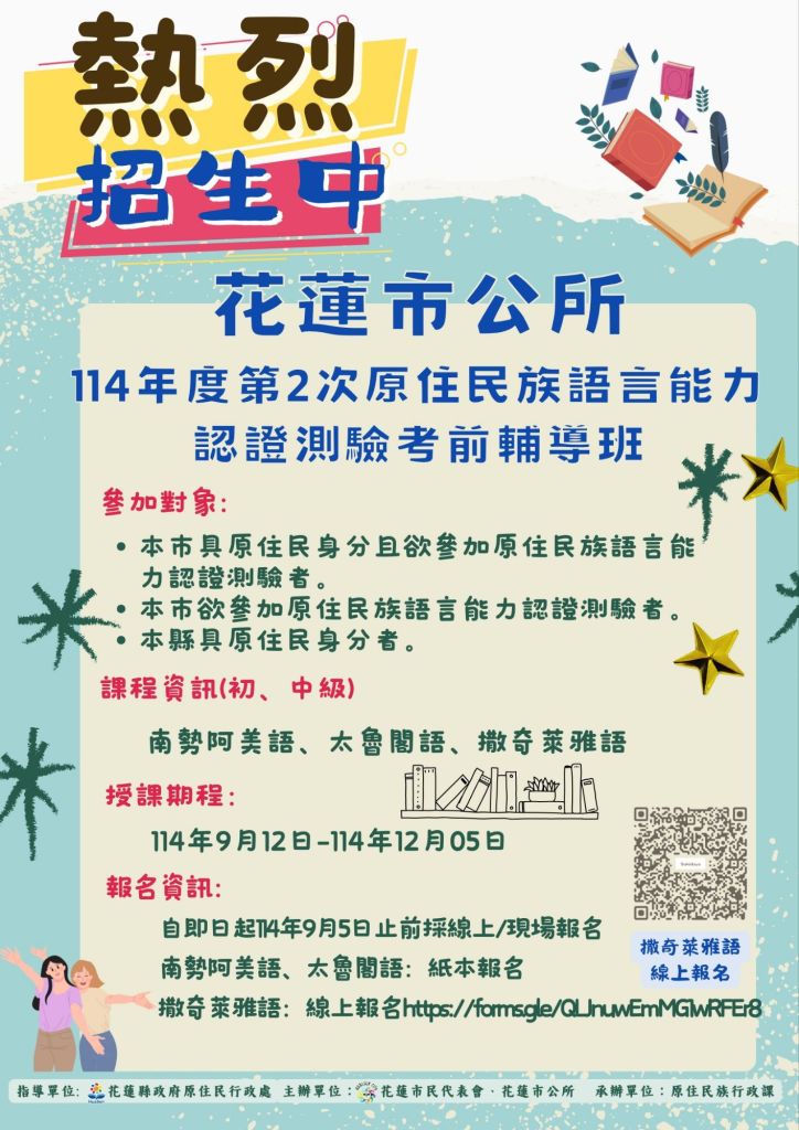 凡具花蓮縣原住民族身分者皆可報名參加。報名自即日起至9月5日止,南勢阿美語及太魯閣語採紙本報名,請至 https://pse.is/7zzk42 下載列印報名表並送交市公所鄭小姐(電話:03-8322141#137);撒奇萊雅語則採線上報名,網址為 https://reurl.cc/A32DoQ 。凡完成課程並順利通過族語認證的學員,將獲贈禮券,以資鼓勵。花蓮市長魏嘉彥呼籲鄉親把握機會,踴躍學習並傳承族語文化。